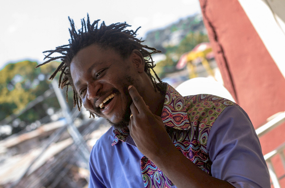 Je suis comédien, metteur en scène et auteur. J’évolue dans le domaine du théâtre entre les villes de Mbanza Ngungu et Kinshasa en RDC, pays multiple, schizophrène, pays de frictions, de collages, de frottements, pays cabossé, comme mon théâtre, un théâtre du scratching, théâtre politique nourri de ces villes, théâtre de l’intime né de mon bégaiement. Un théâtre que je définis comme « un exercice de vérité dans le dire et dans le faire ».