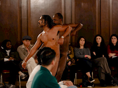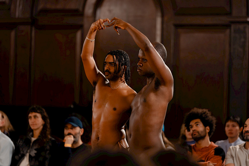 Avec une simplicité désarmante, Pontes et Ferreira dansent au milieu du public, nu·es, sans musique, sur une chorégraphie mêlant synchronicité et suspension. Le battement de leurs baskets sur le sol devient un langage commun, une force qui les rassemble, une marche antimilitaire. Quelques fois, iels se figent, comme s’il allait se passer quelque chose – ou comme s’iels incarnaient les monuments queers et noirs absents des lieux publics.
